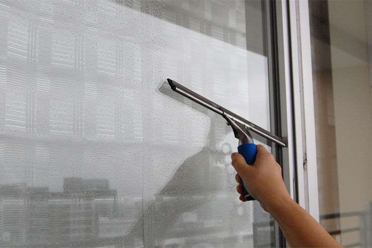 メンテナンス部門の女性スタッフ2名が、窓ガラス専用の綿棒や水切りを使用し綺麗に仕上げます。