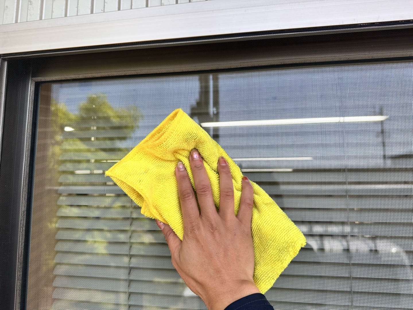 窓ガラスは、高圧洗浄で最初に洗いますが、足場に設置してあるネットからのホコリ等がどうしても付いてしまいます。